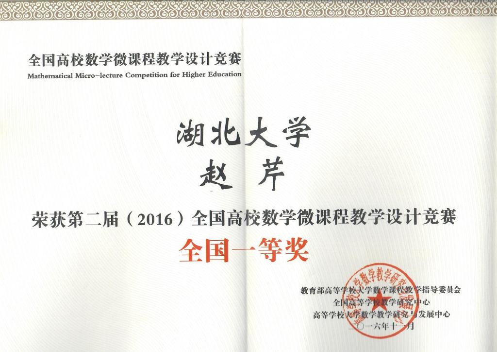 “全国高校数学微课程教学设计竞赛”由教育部高等学校大学数学课程教学指导委员会、全国高等学校教学研究中心共同主办。本届全国高校数学微课程教学设计竞赛至今年3月初启动以来,我院高度重视、精心组织,对参赛教师进行悉心培训与指导。赵芹老师首先以湖北省特等奖的成绩,顺利晋级华中赛区,并荣获华中赛区特等奖。然后经过网络评审及专家会评,从七大赛区(华东、华南、华中、华北、西北、西南、东北)推荐的94件特等奖作品中,选出72件优秀作品进入全国决赛会评。现场决赛于2016年8月7日至9日在吉林大学举行,经过三天的激烈比赛,共产生了44个全国一等奖和50个全国二等奖。