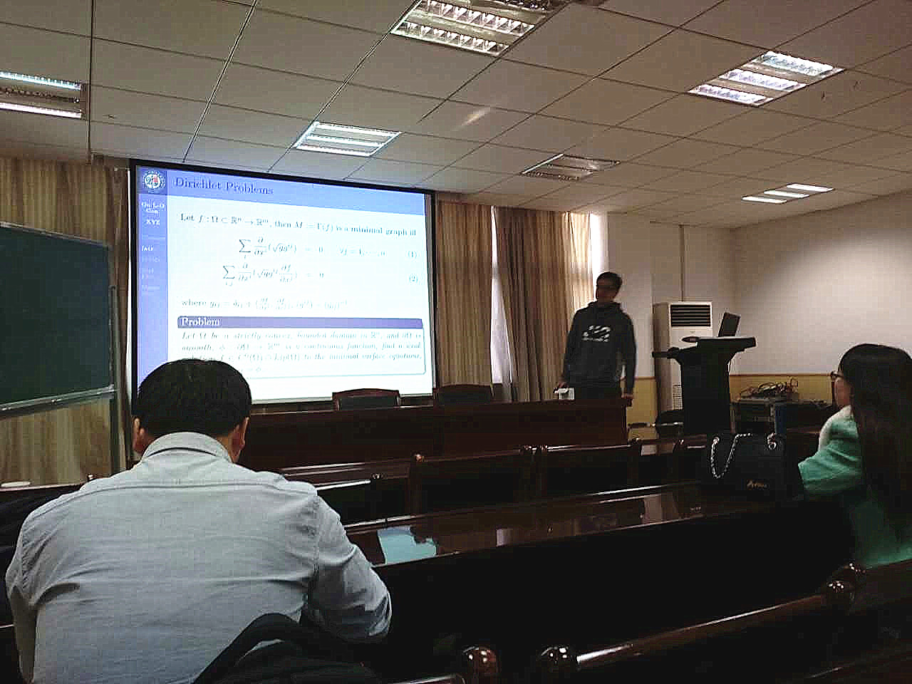 杨教授在报告中主要介绍了边界上的极小子流形、热核等几何方面的内容,并且通过对坐标中图形的合理利用以及对一些相关定理的介绍,生动形象的描述了几何的构造问题。在座导师和研究生对其所讲的内容兴趣浓厚,报告厅到处洋溢着浓郁的学术氛围。