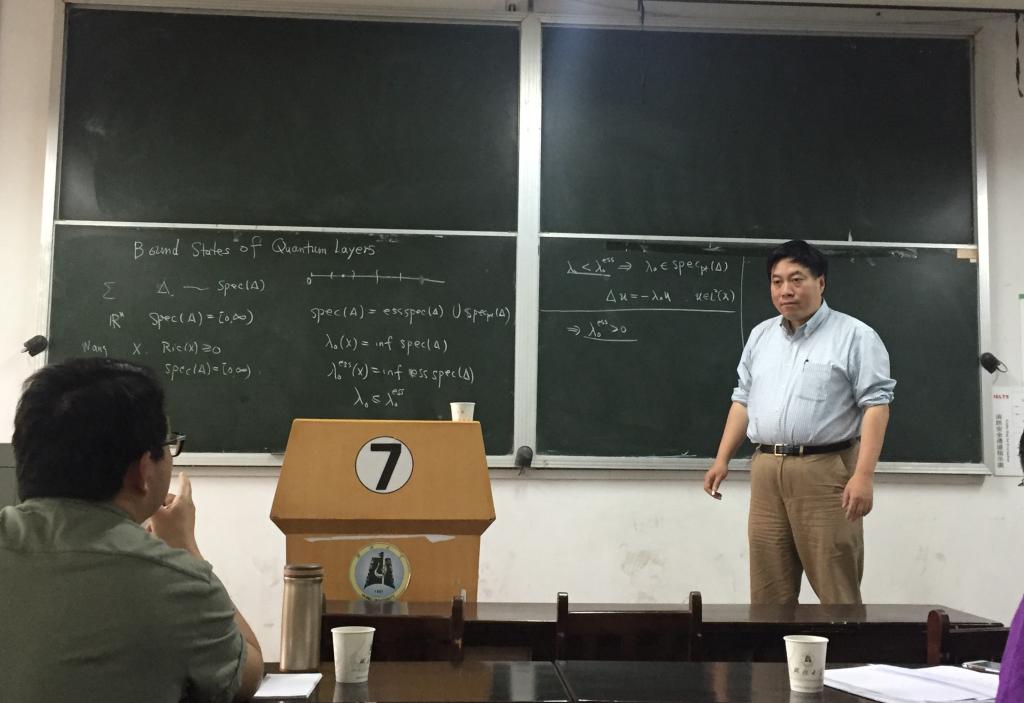 陆志勤教授在报告中介绍了近期的研究进展,给出了3-维欧式空间中的量子层存在无数多个界态的充分条件,并给出了严格的证明。报告结束后,陆志勤教授与在场的师生们就报告内容进行了更深入的交流,大家都表示受益匪浅。