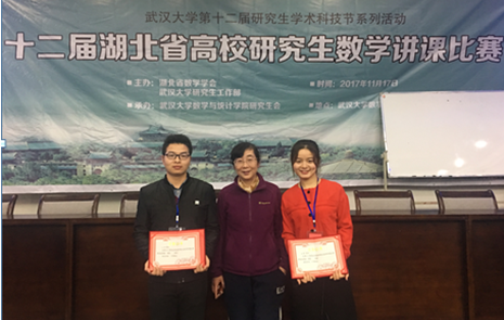 11月17日,第十二届湖北省高校研究生数学讲课比赛在武汉大学举行,我院研究生余晨、王响包揽全部一等奖。