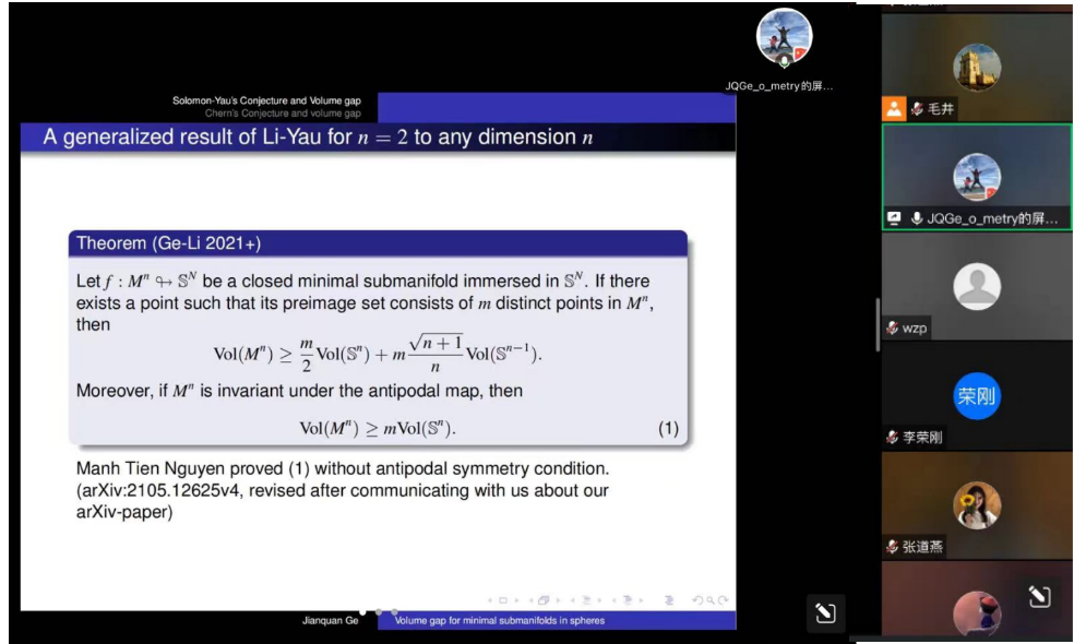 2022年12月22日下午,北京师范大学葛建全教授应邀为我院相关专业的教师与研究生做了题为“Volume gap for minimal submanifolds in spheres”的线上学术报告。