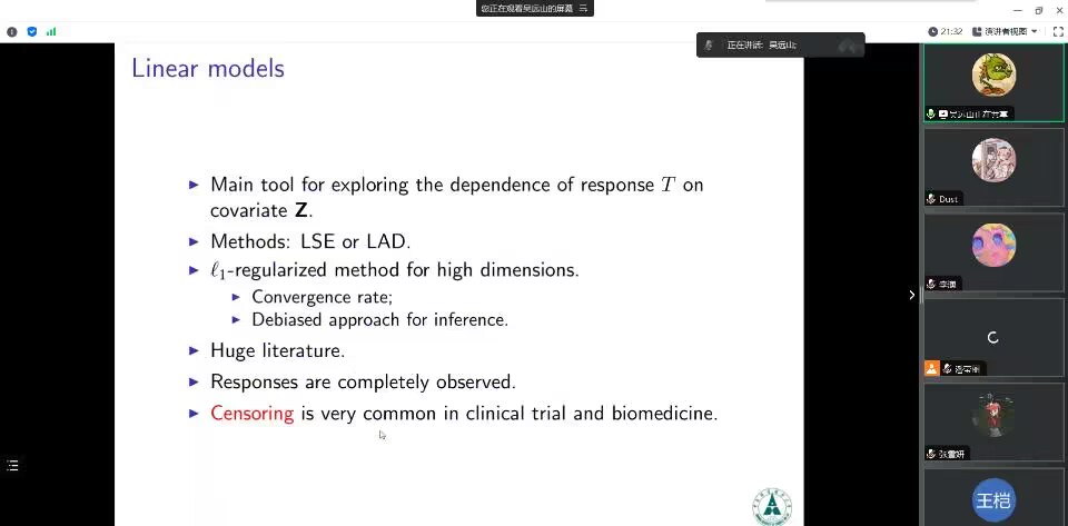 2023年6月14日下午,中南财经政法大学吴远山教授应邀为我院相关专业的教师与研究生作了题为“High-dimensional robust inference for censored linear models”的线上学术报告。