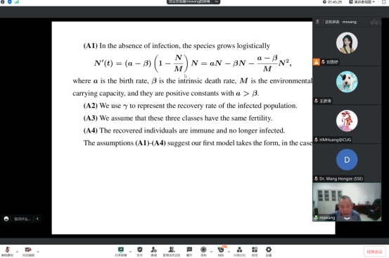 2023年11月16日下午,河南理工大学王明新教授应我院刘思妤老师邀请,为几何团队师生作了题为“The dynamical properties of a new SIR epidemic model”的线上学术报告。