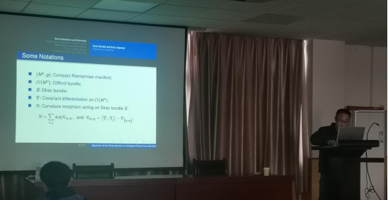 2024年12月7日上午,江西师范大学数学与统计学院曾令忠副教授受邀为我院教师和研究生做了一场题为“Spectrum of the Dirac operator on Compact Riemannian Manifolds”的学术报告。该报告深入探讨了紧致黎曼流形上Dirac算子的谱性质,包括特征值问题、特征值的万有不等式以及近期的一些重要进展和应用。