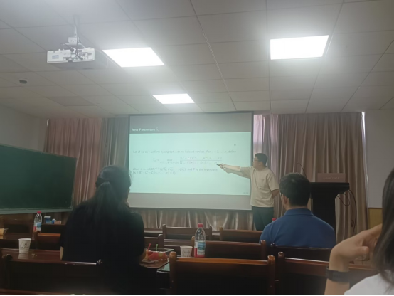 安徽大学刘乐乐博士的报告题目是《Normalized Laplacian hypermatrices and isoperimetric inequalities for uniform hypergraphs》。刘乐乐博士首先向大家介绍了超图相关问题的研究背景以及研究进展,并向大家报告了他们团队的最新研究。最后,刘乐乐博士与本团队教师就超图得谱问题进行了探讨。刘乐乐博士讲解细致、条理清晰,青年教师和学生听后受益匪浅,并对接下来本团队可以进一步研究的问题给出了十分有建设性的意见及指导。