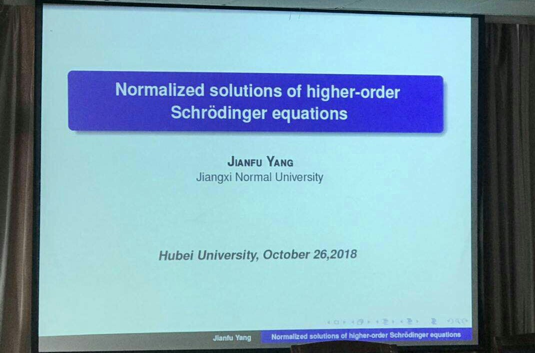 2018年10月26日下午,江西师范大学杨健夫教授应邀来访我院,并为相关专业的教师与研究生做了题为“Normalized solutions to higher-order Schrodinger equations”的学术报告。