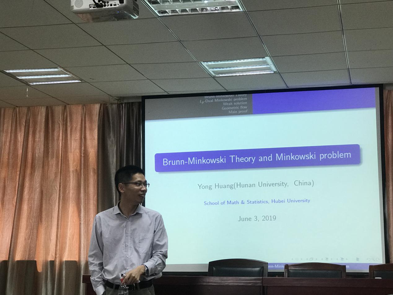 2019年6月3日上午,湖南大学黄勇教授应邀来访我院,并为相关专业的教师与研究生做了题为“Brunn一Minkowski Theory and Minkowski Problem”的学术报告。