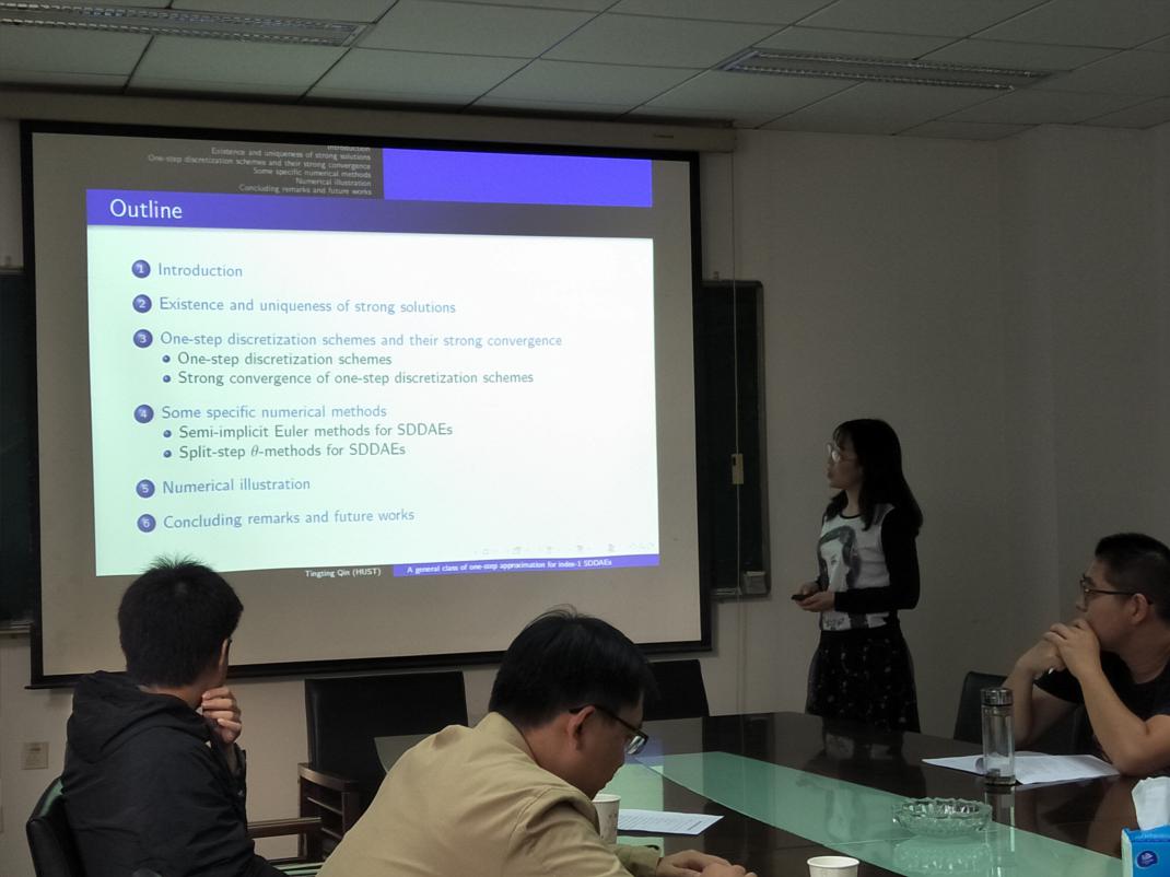 2019年10月24日下午,华中科技大学覃婷婷副教授应邀来访我院,并为相关专业的教师与研究生做了题为“A general class of one-step approximation for index-1 stochastic delay differential-algebraic equations”的学术报告。