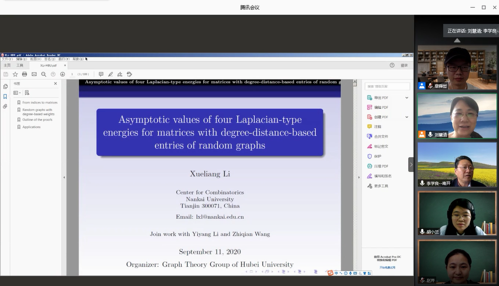 李学良教授在报告过程中,重点介绍了基于度-距离矩阵的能量以及它在数学,化学上的应用,通过对随机图中各类矩阵渐近值的确定,有利于刻画相关问题的极图。报告结束后,李学良教授就师生们提出的问题给予了详细的解答。最后,刘慧清教授对本次报告进行了总结。整个报告过程持续了两个小时,线上报告和交流互动热烈。