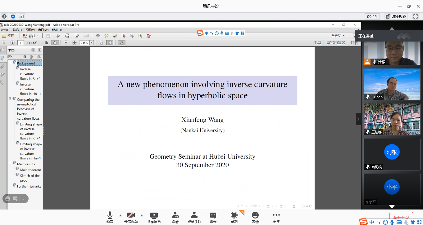 2020年9月30日上午,南开大学王险峰教授应我院涂强老师邀请,作线上学术报告。报告通过腾讯会议举行,由涂强老师主持,来自我院几何团队的教师、研究生10余人参与了报告的听取和讨论。