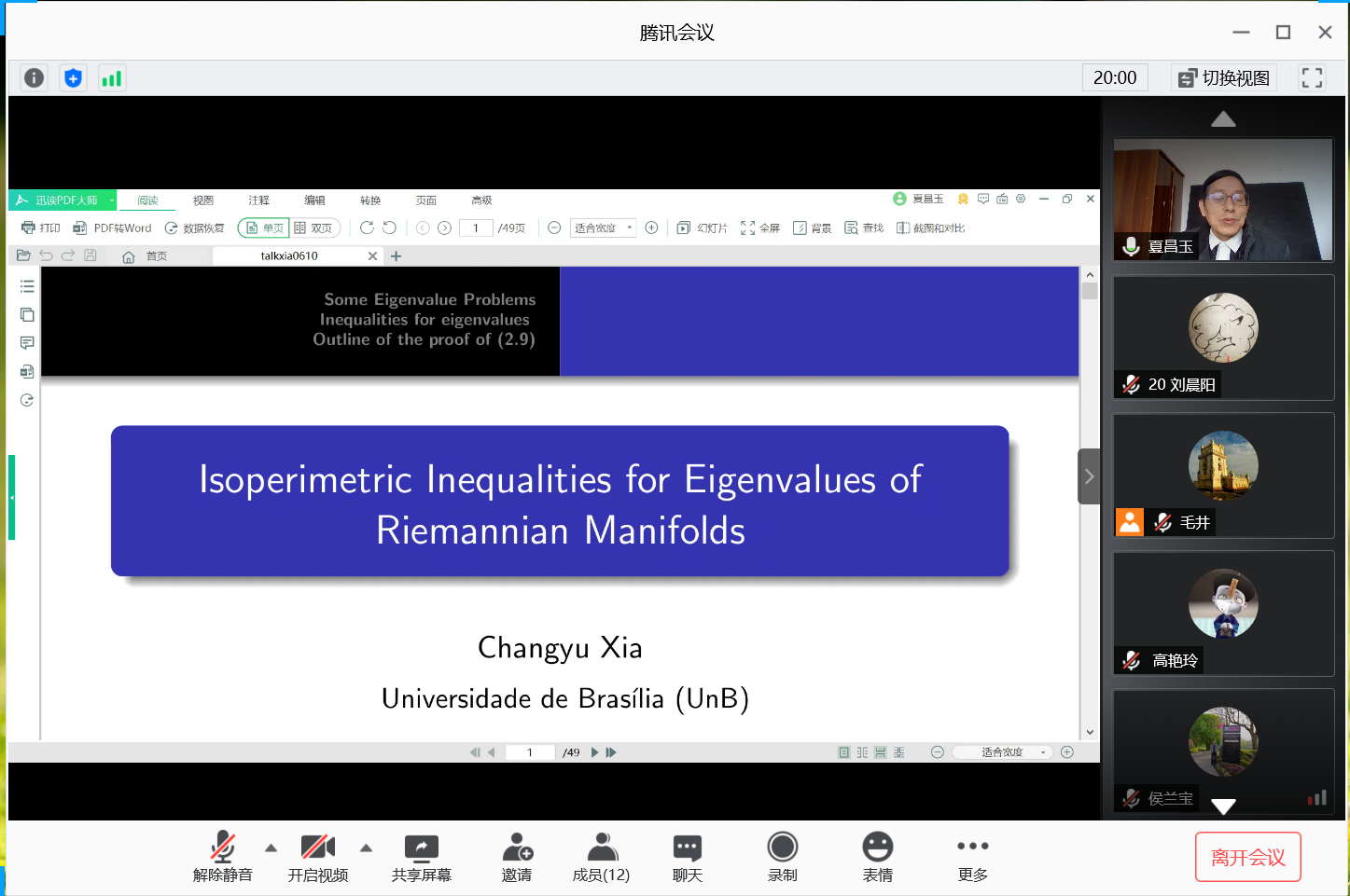 2020年10月6日上午, 巴西利亚大学夏昌玉教授应我院毛井教授邀请,作线上学术报告。报告通过腾讯会议在线举行,由毛井教授主持,来自我院几何团队的教师、研究生10余人参与了报告的听取、讨论。