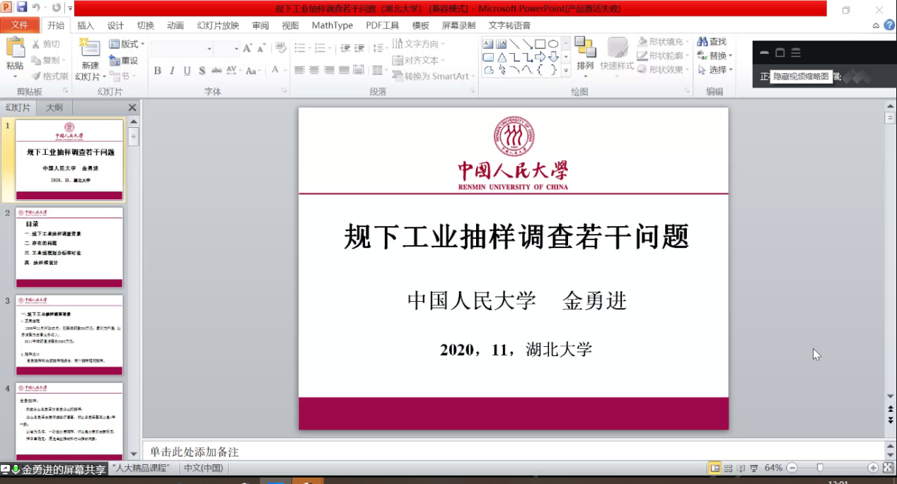 金勇进教授报告题目为《规下工业抽样调查若干问题》,分别介绍了规下工业抽样调查背景、存在的问题、工业规模划分标准及抽样框设计四个方面的内容。其中,存在的问题包括抽样框更新维护滞后、样本与总体存在差异、存在调查误差等。另外,针对产值变化过快、各地发展不平衡导致的工业规模标准划分不准确问题,可以采用边际理论方法和抽样误差方法来解决,重点是要明确划分标准的最大值和最优指标。最后,金勇进教授就抽样框设计中的双框、单框问题进行了详细讲解。