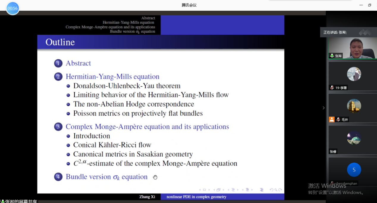 2020年12月9日上午,中国科学技术大学张希教授应邀为我院相关专业的教师与研究生做了题为“Nonlinear PDE in complex geometry”的线上学术报告。