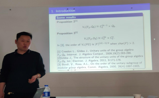 王玉雷副教授做了题为“The unitary subgroups of group algebras of a class of finite p-groups”的报告,首先给出了群代数的相关概念,引出了群代数中的正规化单位群,进一步给出了酉正规化单位群的概念。然后给出一个关于其阶的猜想和已有的在交换群上的结果。最后介绍了自己在非交换群上的一些成果,并进行了具体地解释。