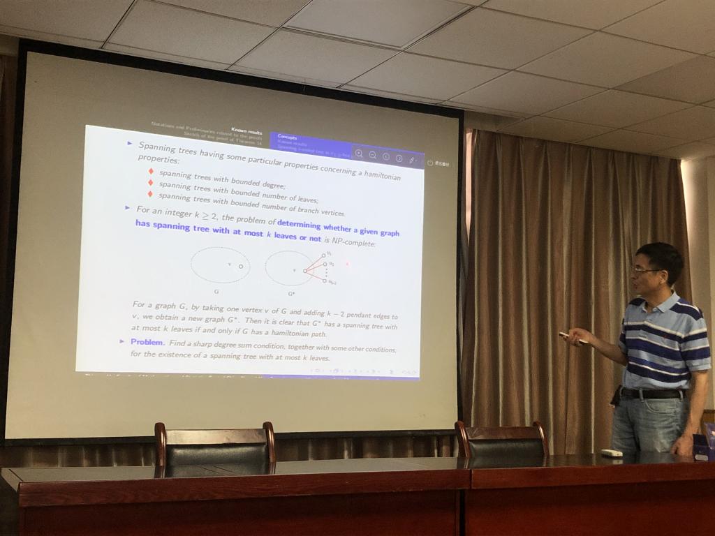 2021年7月12日,华中师范大学胡智全教授和李书超教授应邀来访我院,并在学院201报告厅分别作了题为《Spanning trees with given number of leaves in agraph》和题为《On split graphs with three or four distinct (normalized) Laplacian eigenvalues》的学术报告。