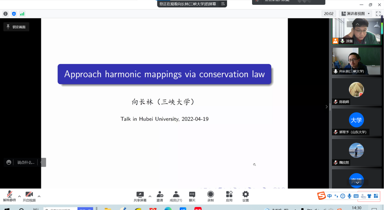 2022年4月19日下午,三峡大学向长林教授应我院涂强老师邀请,为几何团队师生作了题为“Approach harmonic mappings via conservation law”的线上学术报告。