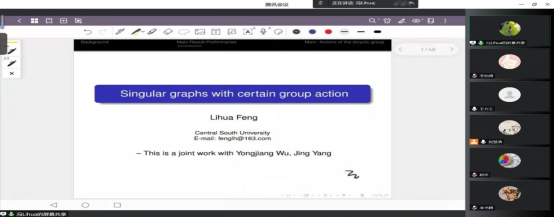 中南大学冯立华教授的报告题目是《Singular graphs with certain group action》, 冯立华老师首先向大家介绍了报告相关的概念以及研究背景,接着就向大家报告了他们团队关于一些特殊群作用在集合上对应的奇异图的最新研究成果。冯立华老师的讲解丰富严谨,给大家带来了很多的启示。