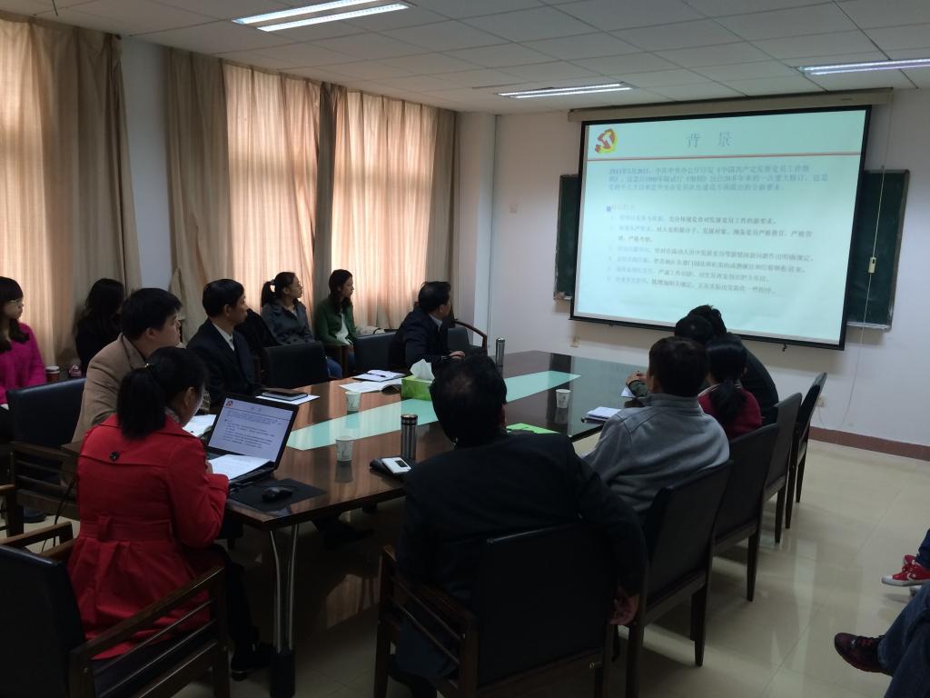 2014年11月5日,yl23411集团党委组织集中学习《中国共产党发展党员工作细则》,会议请到了校党委组织部何肖对新的《细则》进行了解读。学院党委书记游春林、党委副书记陆伟及党委委员、教师党支部书记、各学生党支部书记和部分学生党员骨干参加学习。