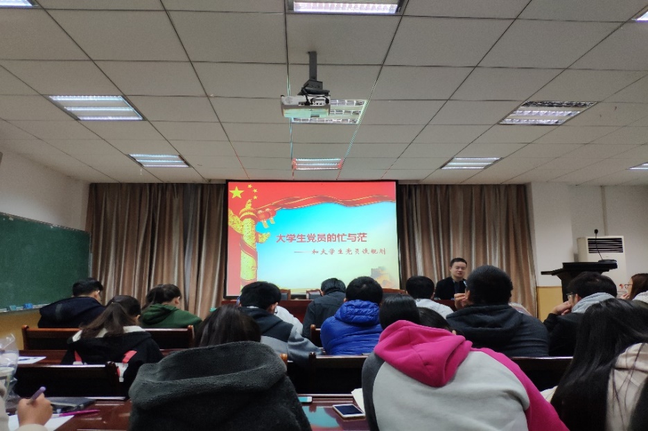 2018年11月7日晚七点,yl23411集团团委书记周杰于本院201为大家讲解主题为“大学生党员的忙与茫”的党课,本院的入党积极分子参与学习。