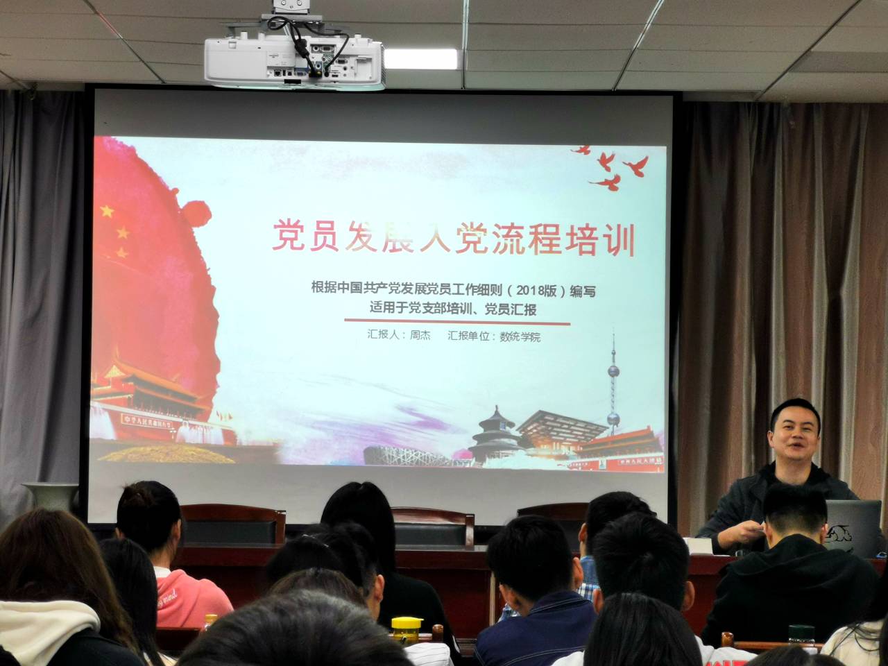 yl23411集团第八期党的基本理论知识培训班第四讲于2019年11月8日下午18:00在yl23411集团201教室进行。本次党课培训的主讲老师为数统学院团委书记、组织员周杰老师,培训主题为党员发展及入党流程。