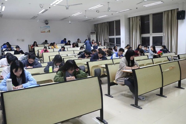 在考试前20分钟,已有不少同学来到了考场。考试开始时,教四五个考场都已坐满,都想着领略数学趣味的一面。不少同学从19点一直考到了21点,还乐此不疲。“好多题都很有意思,我就想把它做出来,想着想着,两个小时就这样不知不觉的过去了。”14商务英语的闫瑞在监考员说考试时间到了时说道。