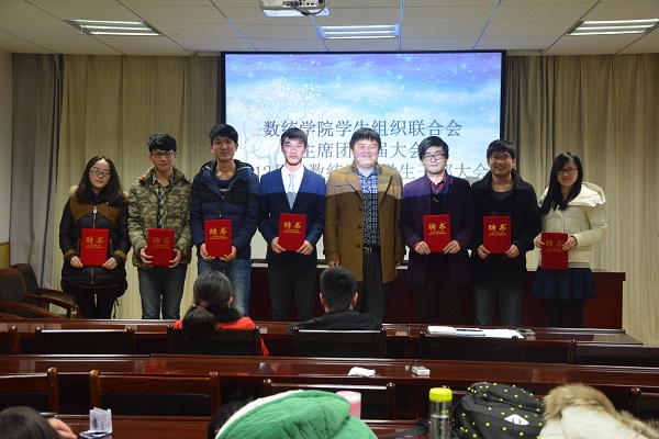 12月29日晚,数统学院学生组织联合会主席团换届大会暨12月份数统学院学生干部大会在院201报告厅顺利召开,党委副书记陆伟及学工办老师周杰、陈冰和马荣参加了此次会议,会议由组织部部长范馨主持。