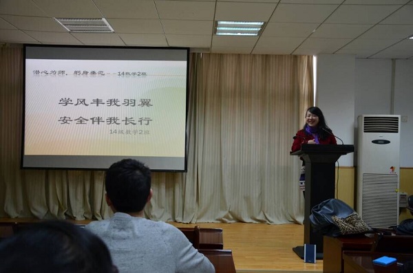3月18日下午,14数学二班在院201报告厅开展了“学风•安全”主题班会,院长曾祥勇、班主任甘珣参加了此次班会,班会由班长余琴和黄卓主持。同学们也以情景剧的形式向大家展示了安全方面的知识,最后曾祥勇院长为此次班会做了总结。