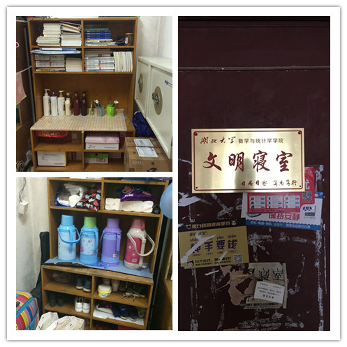 学院十分重视寝室环境与氛围,每月将进行一次文明寝室的评选。张贴数统学院文明寝室标牌,并在数统学院优秀班集体评选过程中给予加分奖励。
