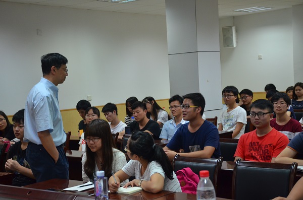 郭教授一开场便用美国城市建筑与中国城市建筑的比较进行了引入,他说,中国的城市建筑整体要比美国的强,这和我们中国人的整体数学能力比美国人的整体数学能力要强是一样的。但是为什么我们获得著名数学奖或者是其他领悟的诺贝尔奖很少?郭教授用正态分布概念为我们做了解惑。整体能力可以看做是均值,体现两端差距的是方差,我们缺少极其顶尖的数学科学家大概是因为我们方差太大了。同时,郭教授在“问”方面提出了自己的看法,他说要学会问问题并敢于问问题,问题是为自己而问,不是为别人而问,不要怕自己问的问题太蠢而被别人耻笑。要学会和别人讨论,如果想要自己得到提升,最重要的是要敢于和自己的老师讨论,提出一些有价值的问题去和老师进行探讨。要全方位的学习,否则阅读一些文献的时候会有困难,建议去读一些名人传记,从中会发现很多人不是天生聪明,而是后天的努力去弥补先天的不足。
