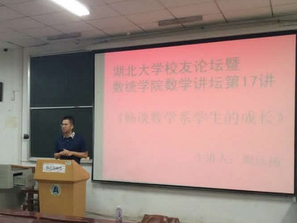 9月27日下午,数学系93级校友、华中师范大学国家杰出青年科学基金获得者周远扬教授应邀返校,为数统学院师生做题为《畅谈数学系学生的成长成才》的讲座。
