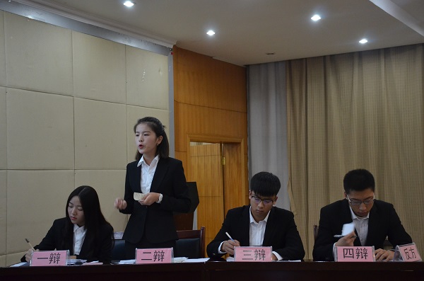辩论赛分为开篇立论、辩驳立论、自由辩论和总结陈词四个环节。主持人陈玉晶宣布辩论赛正式开始,正方一辩喻程便抛出“男人比女人更需要关怀”的论点,继而充实立论,把握开场优势。反方一辩陈晓烨也非凡辈,她对正方的破绽展开攻击,积极阐明自己的立场“女人比男人更需要关怀”。辩驳环节,正方二辩吕杰锴和三辩曹俊杰环环相扣、步步紧逼,向反方展开连环攻击,反方二辩刘晓映和三辩陈辉处惊不变,始终面带微笑,沉着应对。自由辩论备受瞩目,双方辩手神态自若,场上局势确是剑拔弩张,正方辩友纷纷从法律的角度寻求论据引证自己的观点,反方辩友也着眼于法律,给予很好的回击。总结陈词,双方四辩各据一方,据理以争,努力把握最后的时机。
