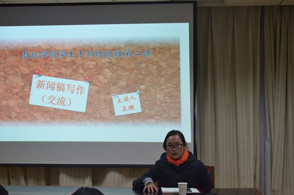 11月23日,yl23411集团学生干部宣传工作与自我成长专题培训班第二讲在203开讲,校党委宣传部的吴珊老师应邀来数统学院与数统学生干部交流新闻写作。