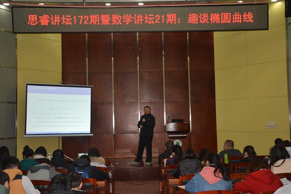 上午,王杰教授做客yL23411永利集团思睿讲坛172期暨数学讲坛21期,做了一期题为《趣味椭圆曲线》的讲座。王教授从圆锥曲线出发,讲到了椭圆积分的反函数以及弧长的反函数,并由此说到了椭圆曲线在密码学中的应用,说到连接起椭圆曲线和密码学的离散对数,并就1976年提出的公开密码体制为例,做了详细的说明。其间,他谈到了双周期函数,费马大定理,并穿插着讲了许多有趣的数学相关的故事。他鼓励同学们在学习数学时要充分发挥想象力,他说:“数学绝对不是单纯的逻辑,逻辑只是很小的一部分,最主要的是你要看到别人看不到的联系和关系等等这样一些东西。”