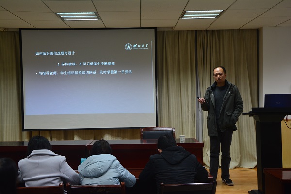 11月25日,数统学院学生干部培训班第三讲在数统院201开讲。此次培训班邀请到的是校党委宣传部的刘曦老师,他针对微信的选题与设计开展此次培训,院团委老师周杰以及学院学联会的所有学生干部参加了此次培训。