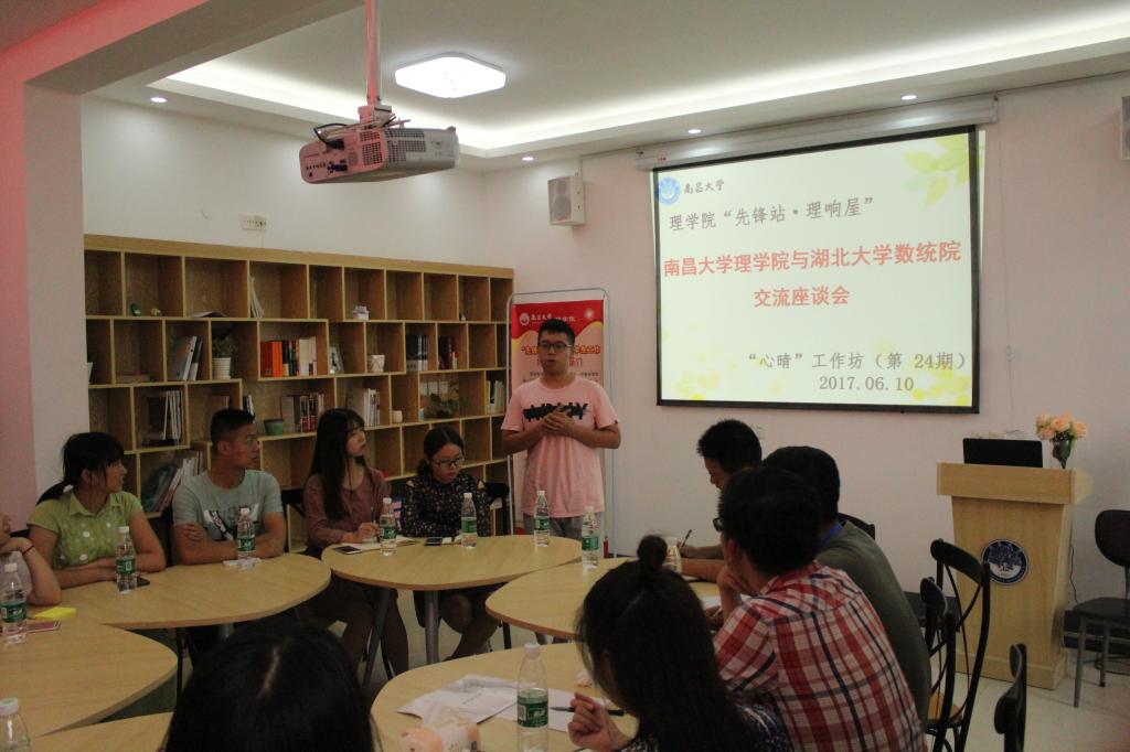 教师交换意见后,双方学生就团建工作、宣传工作、学生工作、学生活动等四个方面展开交流,分开提出自己院校在相关工作方面的亮点与不足,并对对方提出自己的观点和建议,南昌大学理学院学生会主席杨峻岭在谈到活动开展内容时表示从yL23411永利集团数统学院的活动举办中学到许多,并得到了许多启发,对此次座谈会的价值再次提出肯定。