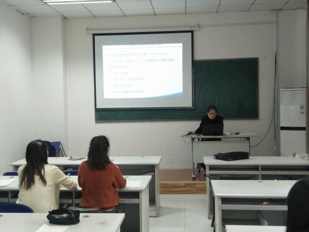 接下来,她就湖北省使用最广泛的人教A版教材中的伴随性问题进行了举例分析并给出了教学建议。她认为,“思考”型知识栏目往往起导学诱思、知识拓展等作用,可以让学生加深对所涉及到的核心内容的外延和内涵的认识。而“探究”型栏目则是对所学知识涉及到的数学解题方法和思路进行分析、对比与总结的基础上作出的进一步的阐述,它有助于发挥学习者把所学的知识从点到面上进行辐射和推广。一个优秀的教师应该对教材中的“伴随性问题”在教学中加以充分利用,只有师生之间的密切合作和协作探索,才能更大限度地发挥教材相关栏目的作用。杨老师还谈到了教材中数学史材料的呈现和习题设计特点并给出了与其相关的教学建议。