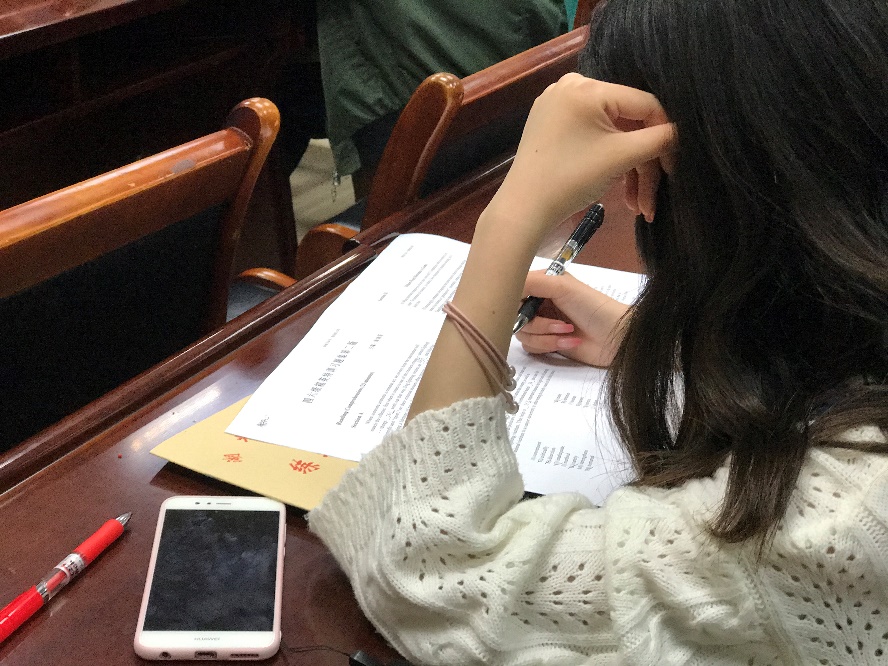 本次培训分为三个环节——专项训练、试题讲解、单词听写。第一个项目中,学科部干事耿雨萱分发训练题,此次训练题目为十五选十和长篇阅读,参与培训的同学需限25分钟内完成,未完成者须接受惩罚。第二个项目中,英语成绩优异代表赵若雯根据题目中的难点、易错点、重点进行了详细的讲解,台下的同学皆认真的聆听、做笔记。第三个项目中,学科部干事巩媛媛报了20个英语单词让众人听写。三个环节结束后,耿雨萱对于各个人的学习情况及进行了奖惩汇报。在采访耿雨萱的过程中,她说到:“此次四六级培训主要以四级考核内容为主,后期再提高难度,重在巩固基础、找到学习方法,也是为了让大家通过英语四六级考试。”