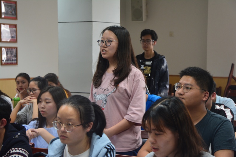 随后团支委向每位成员分发五四知识记录手册,给予每位团员3-5分钟的自主学习时间来了解五四运动的相关知识。在学习时间结束后,主持人依次的公布五四知识题目,全体团支部都可通过举手抢答,回答正确记分,最终20道题目回答完成后,总分前6名获得由团支部提供的奖品。抢答环节十分激烈,各位同学以从中进一步巩固学习了五四相关知识。在团日活动的最后,由主持人带领大家对着团旗进行宣誓。