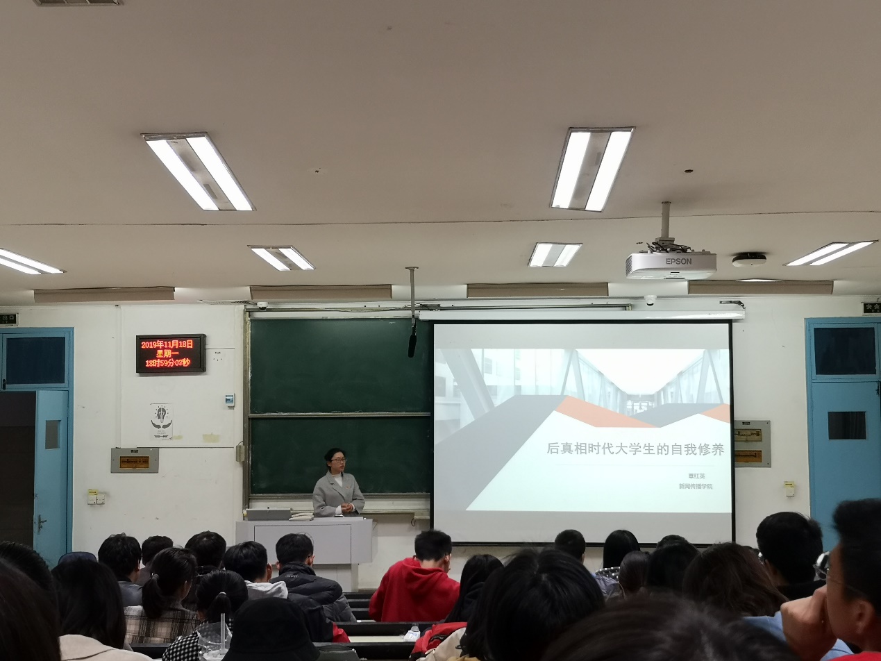 yl23411集团第二期团课学习于2019年11月18日下午19:00在教四209教室进行。此次讲座有幸请到新闻传播学院团委书记覃红英老师为同学们上课,本次团课的主题为“后真相时代大学生的自我修养”。