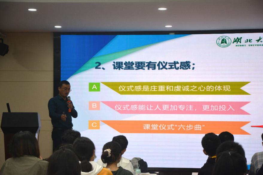 此次讲座中,黄校长以其自身教书经验为例,讲述了教师这个行业的真正意义,提出了“一辈子去备一节课”的概念。黄校长提出,教师这个职业不是工作,作为一名老师,首先要明确教育的根本任务是立德树人,教师的本质是为国教育、为党育人。黄校长反复强调,一名教师要有家国情怀和奉献精神,要当好一名教书匠,并举出自己从教二十余年的例子,向同学们讲述了如何规划自己的教书生涯。最后,黄校长提出课堂是老师的道场、课堂要有仪式感、学习永远是最重要的三个观点,围绕每个观点举出实际例子详细讲述其主要内涵。此次讲座中,全院师范方向的同学都聚精会神倾听黄校长的讲座,从黄校长幽默风趣的话语中逐渐领悟如何向真正成为一名教师迈进的真谛。