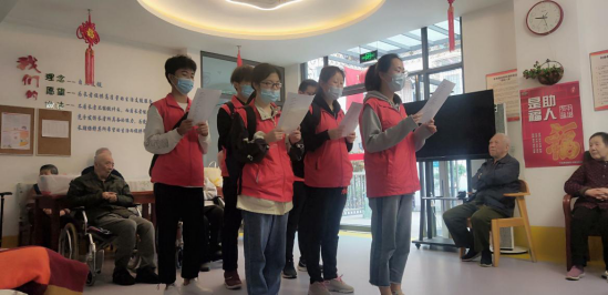 党史学习教育开展以来,数统学院立足实际,坚持边学习、边实践,多措并举扎实推进“我为群众办实事”实践活动,用实际行动迎接建党100周年。4月24日上午,数统学院暖阳志愿服务队的悦善养老院小分队早早出发,前往悦善养老院。这是每两周都要举行的常规志愿活动,但是今天他们为老人们准备了一个特别的节目——朗诵《党在我心中》。