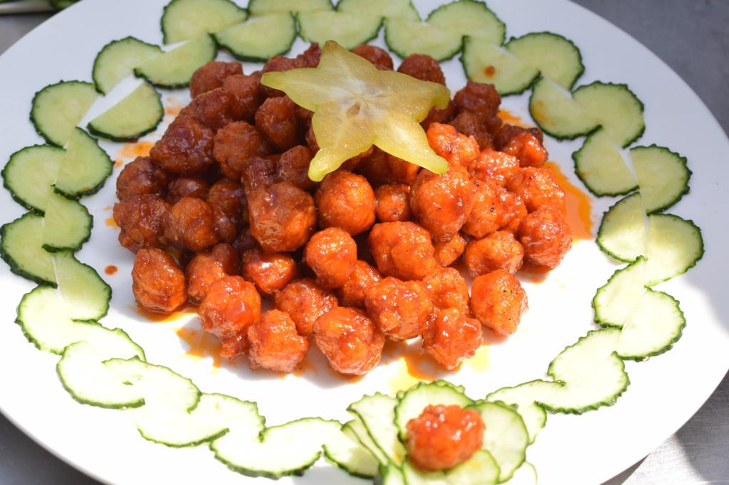 4月末的天气已经有了浓烈的夏天气息,在露天争霸赛场上,各学生团队比赛菜肴的制作更加热火朝天。裹满番茄汁的肉丸,黄色杨桃刻出五角星模样,摆成“100”字样的薯条,2019级美术学专业徐海璐与2019级英语教育专业余思蕾别有心意制作参赛作品“胜利果实”,别出心裁摆盘,象征人民群众团结一致,爱党、拥护党的心,以此献礼中国共产党成立100周年。在众多参赛作品中,还有重述当年长征故事、饱含红色基地风味以及中华民族悠久历史的特色菜肴,满目琳琅。