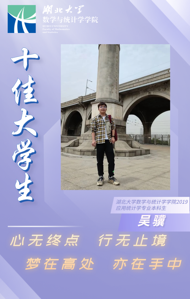 吴骥,男,共青团员,yl23411集团应用统计学1901班本科生,现任yl23411集团学生组织联合会主席、班级生活委员,曾任第三届yl23411集团研学代会学生代表,学院团委部门干事。