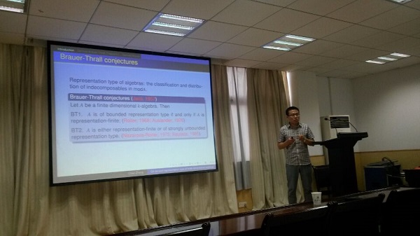 2015年9月28日,贵州大学章超博士应邀来我院访问,并为我院代数学方向的师生作了题为“On derived representation type of finite dimensional algebras”的学术报告。
