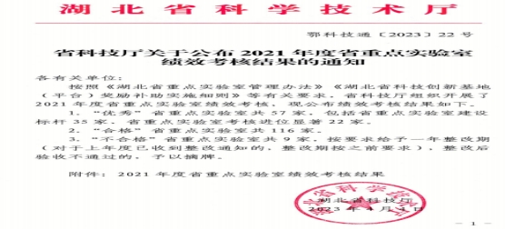 近日,湖北省科学技术厅印发了《省科技厅关于公布2021年度省重点实验室绩效考核结果的通知》(鄂科技通【2023】22号),公布了省重点实验室2021年度绩效考核结果。我院“应用数学湖北省重点实验室”获得“优秀”(建设标杆)等次。据悉参加本次考核的实验室全省共182家,“优秀”57家(其中建设标杆35家,进位显著22家),“合格”116家,“不合格”9家。这是自2016年以来连续6年的绩效考核中,该实验室获得的第4次“优秀”,另有2次“良好”。