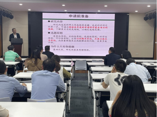 会上,曾祥勇院长强调,要从学院整体发展、教师个人成长等多角度认识和看待国家自然科学基金项目申报工作,全体教师特别是青年教师要主动参与、积极申报。报告中,他结合自身多年申报、评审国家自然科学基金项目的经验,着重围绕科学问题属性、申请书题目、摘要、报告正文、关键科学问题凝练、申报书样例及其格式等方面,通过实际案例分析,与大家分享了申请书的撰写要点和和注意事项,全面地解析了一份高质量申请书的撰写过程。他指出,国家自然科学基金项目的申报并非一日之功,需要老师们持之以恒、坚持不懈,相信最终一定能够取得成功。