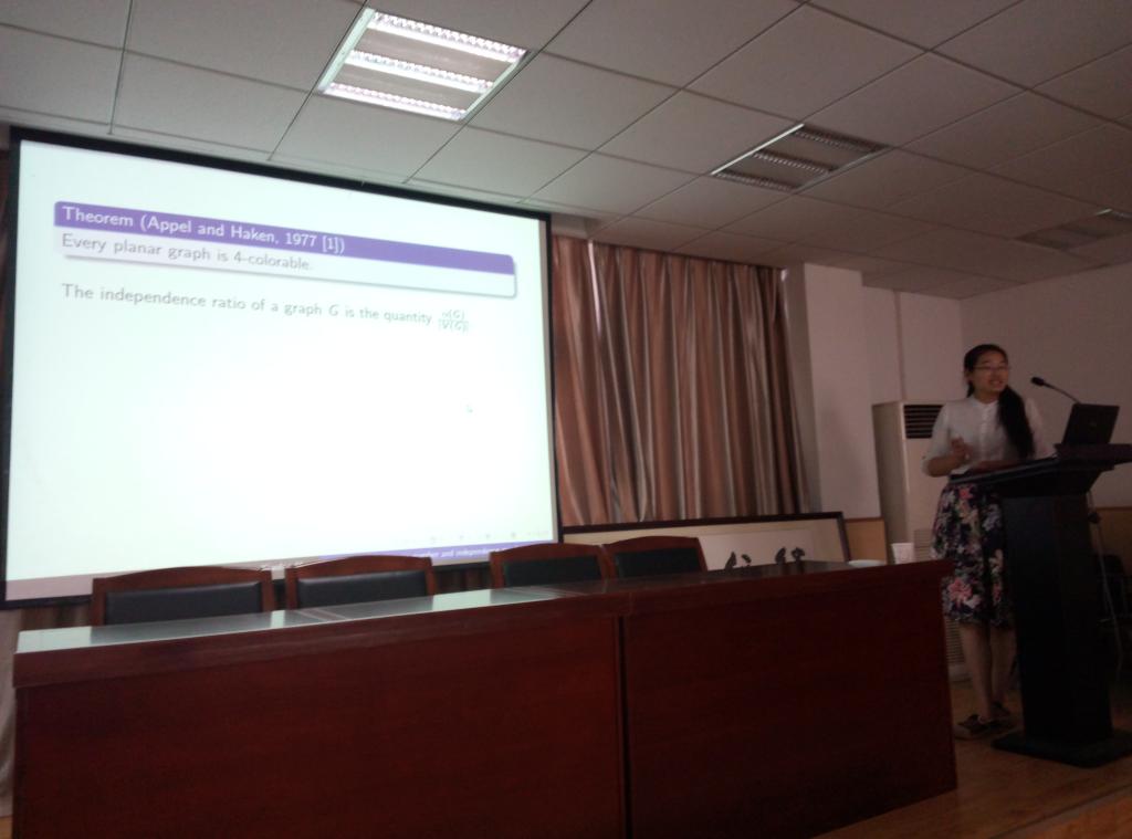 胡小兰博士的报告题目为《Fractional chromatic number and independence number of planar graphs》。报告中,她介绍了关于平面图的分色数和独立数的一些结论,其中包括已有的结论和她本人做出的成果,并且在报告过程中提出了一些这方面还未解决或者可以尝试突破的方向,引起了在场师生浓烈的兴趣。