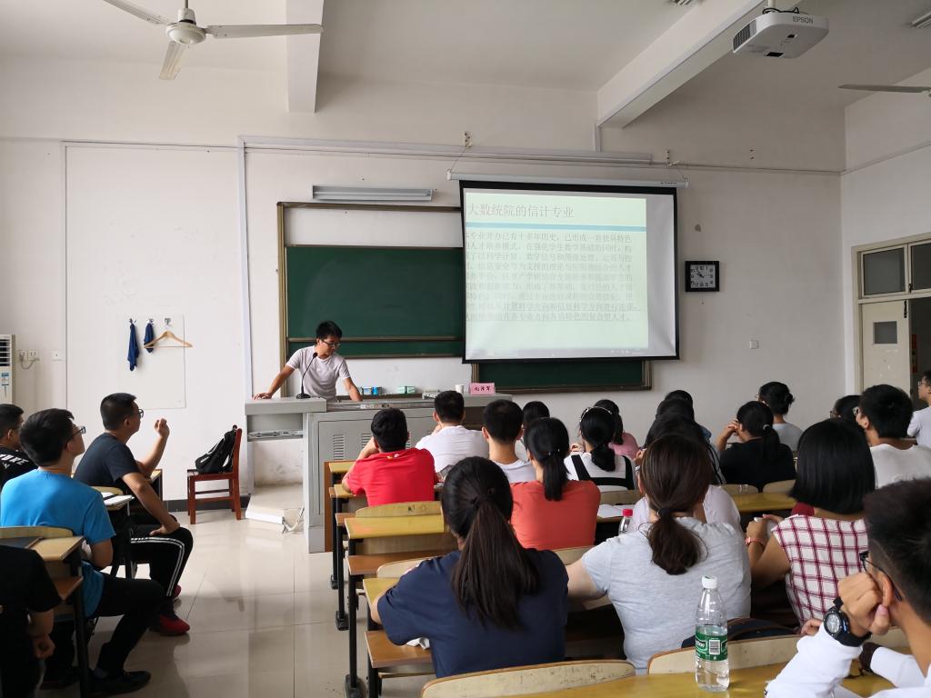 新生见面会之后,三个专业又分别进行了专业教育。数学专业的毛井老师,以著名数学家陈省身展开讲座,以数学中曲面角的计算激励同学们学习数学的信息,鼓励同学们体会数学的乐趣;信息与计算科学专业的向泽军老师为新生展示了信息与计算科学这个专业的前景和发展方向,让新生对信科专业有了一个较为完整的认识;应用统计学专业的刘展老师讲述了大数据在生活中的应用,展示出统计学的魅力。