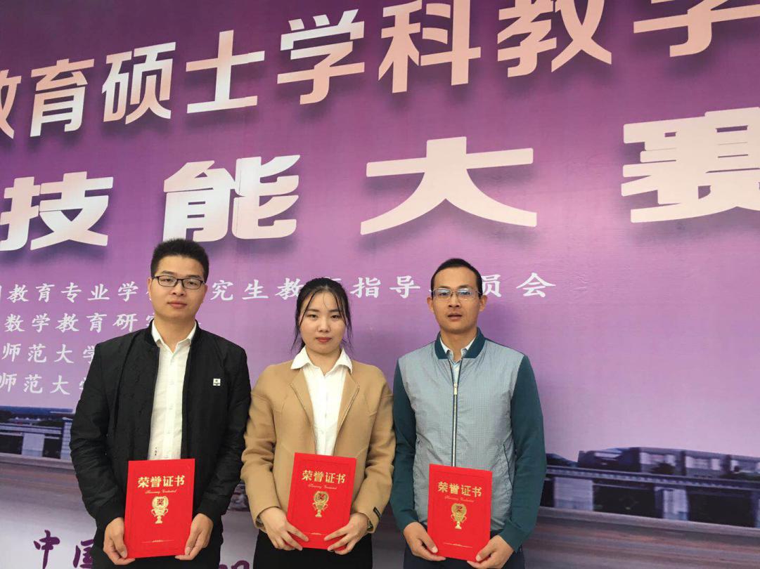 2018年9月15-17日,第三届全国全日制教育硕士学科教学(数学)专业教学技能大赛(决赛)在云南师范大学举行。我院学科教学(数学)专业2017级硕士研究生姜艳、王响、马小波同学分别斩获一等奖、二等奖、三等奖各一项,指导老师刘芸被评为“优秀指导教师”。
