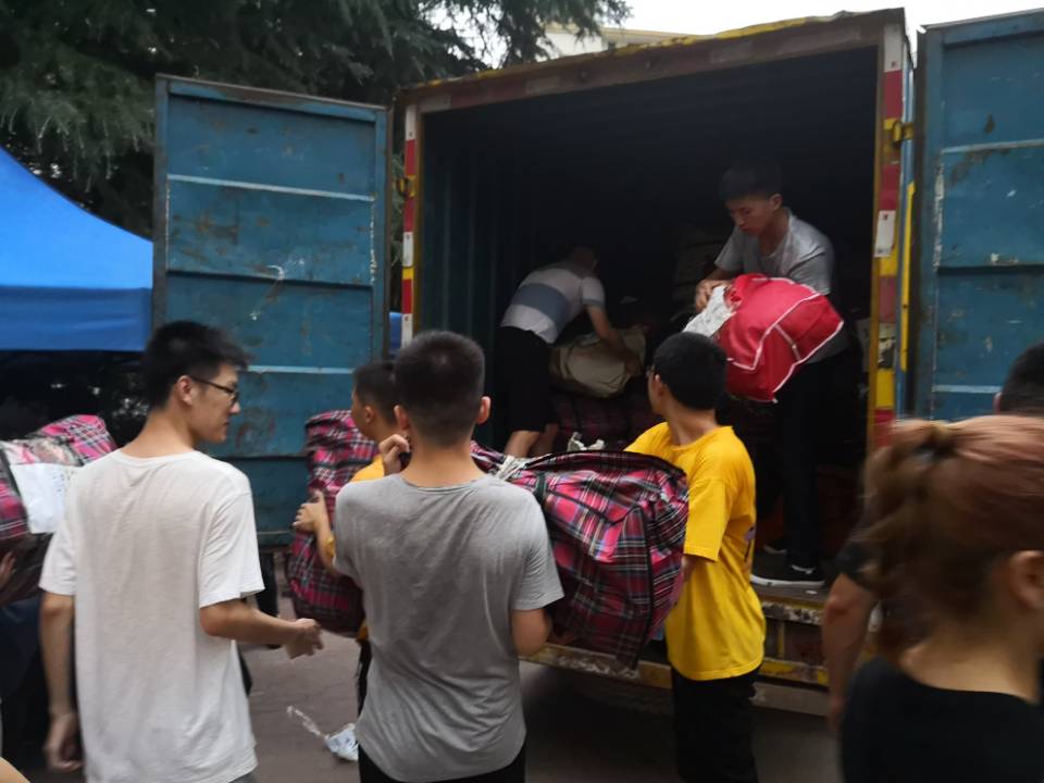 晚上19点左右,装载数统学生行李的第一辆货车到达三期公寓。院党委书记、副书记、学工办老师和18级各班班主任在现场协调回迁工作。晚上8点,突降大雨,但是负责迎接阳逻学弟学妹的志愿者们丝毫没有懈怠,许多人全身被雨淋透,毫无怨言。在回迁过程中,许多老师都加入了搬行李的队伍。